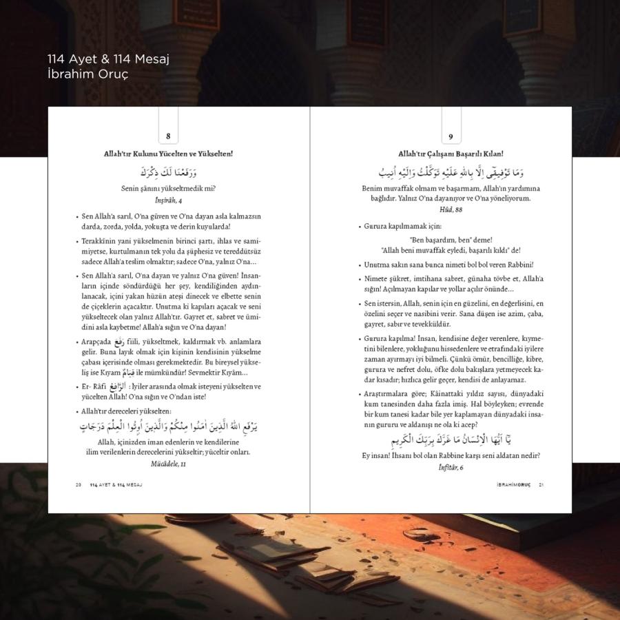 Kitap, Kur'ân-ı Kerim'de verilen farklı ve önemli mesajları ihtiva etmektedir. Âyet-i kerimelerde geçen bazı kelimeler, köklerine inerek farklı bir bakış açısı ile değerlendirilmiş; buradan hareketle de âyetlerin bizlere mesajlarına yönelik çıkarımlar yapılmıştır. Kur'ân-ı Kerim'den, bünyesinde Arapçanın da anlam zenginliğiyle birçok mesaj barındıran 114 âyet-i kerime titizlikle seçilmiş ve işlenmiştir.