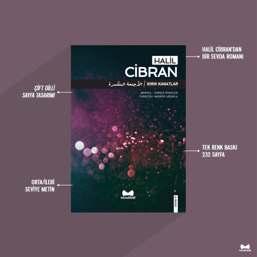 Kırık Kanatlar, Muarrib'in ikinci eseri. Halil Cibran'ın en ünlü eserlerinden biri olan romanın çevirisi Marmara Üni. İlahiyat Fakültesi Çeviri Atolyesi ekibinden Ahmer Harman, Burak Duran, Emrullak Kurt, Halil İbrahim Salman, Kamile Kaş, Merve Şahin, Sümeyye Oyan, Zeynelabidin Soysal tarafından, son okuması ise Kadriye Uğurlu tarafından yapıldı. Editörlüğünü Abdussamed Yeşildağ, yönetmenliğini Muhammed Yasin Can üstlendi.