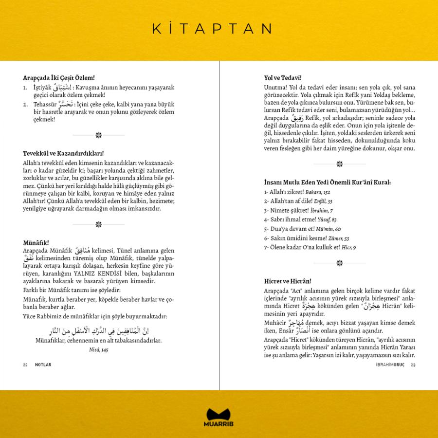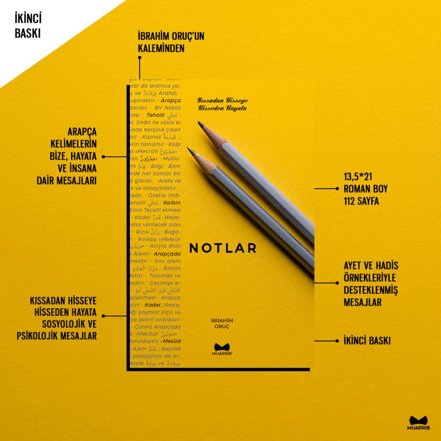 Notlar, Muarrib'in 34. kitabı. İbrahim Oruç Hoca'nın kaleminden, Arapça kelimelerden hayata, insana ve ruha dair, ayet ve hadislerle örneklendirilmiş sosyolojik ve psikolojik mesajlar içerir.