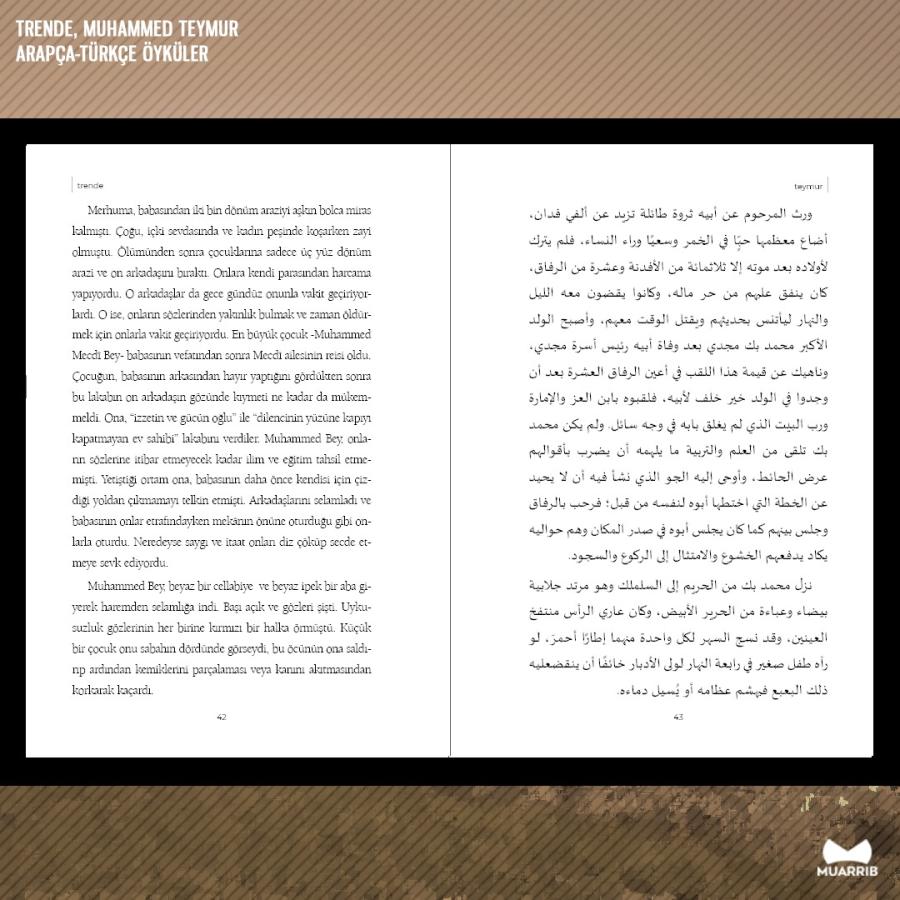 Trende, Muarrib'in 29. yayını. Modern Arap öyküsünün öncüsü kabul edilen Türk asıllı Mısır vatandaşı olan Muhammed Teymur'un (1892-1921, Mısır) öyküler derlemesi olan kitabın Türkçeye tercümesini Kübra Kilci ve Merve Tekin üstlendi. Son okuması Hüseyin Örs tarafından gerçekleştirildi. Eser, dönemin Mısır halkını ve sosyal durumlarını yansıtan, Teymur'un Fransız dramasından etkilenmiş üslubuyla ve tüm unsurlarıyla modern kısa öykü türünde yazılmış, figür ve diyaloglara yer verilmesiyle tiyatrodan etkilendiğini anlayabileceğimiz öykülerden müteşekkildir. Orta düzey Arapça talebesine ve bilirine rahat, kolay ve duygu yüklü bir okuma sunduğunu pek ala söylemek mümkün.
